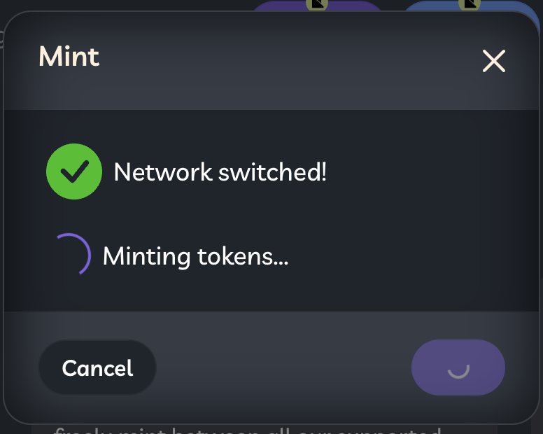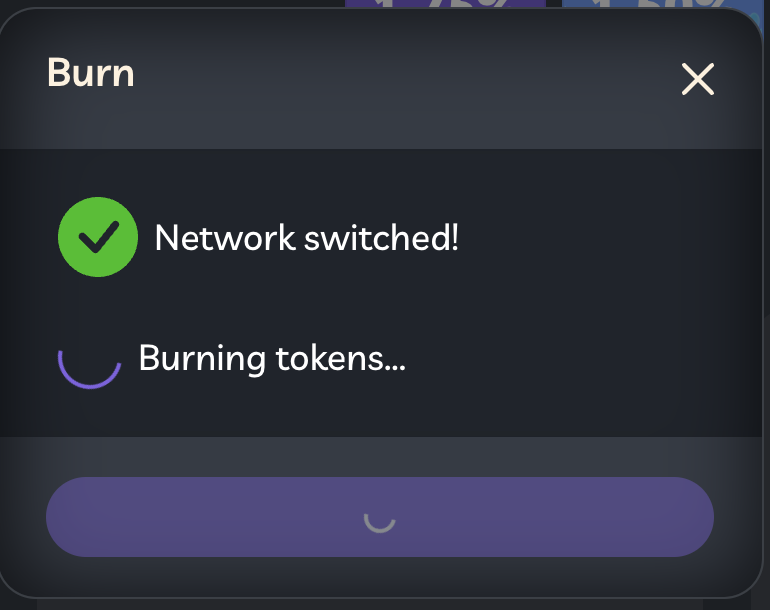 * 3\) Once again, this process is two-fold: you'll first have to switch networks, and then sign the burning transaction. You can follow the progress of these steps on the modal window.