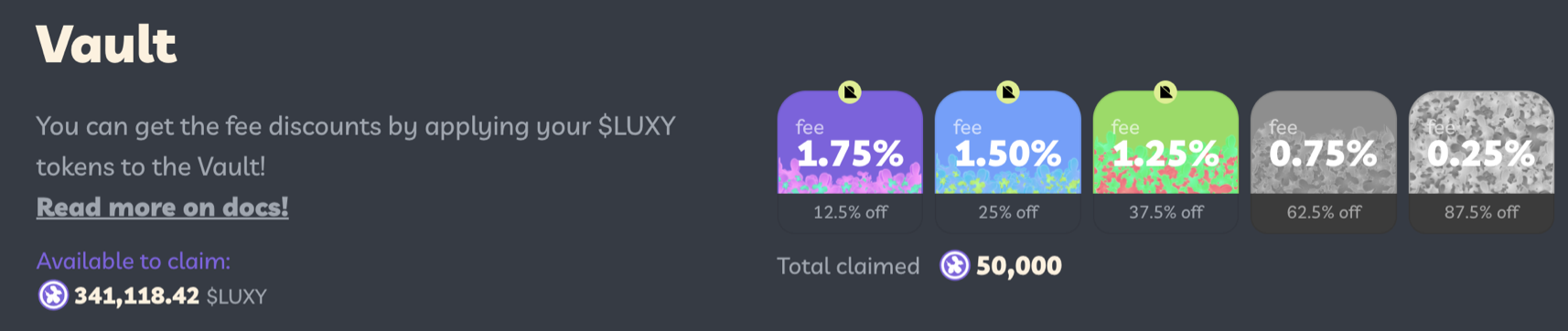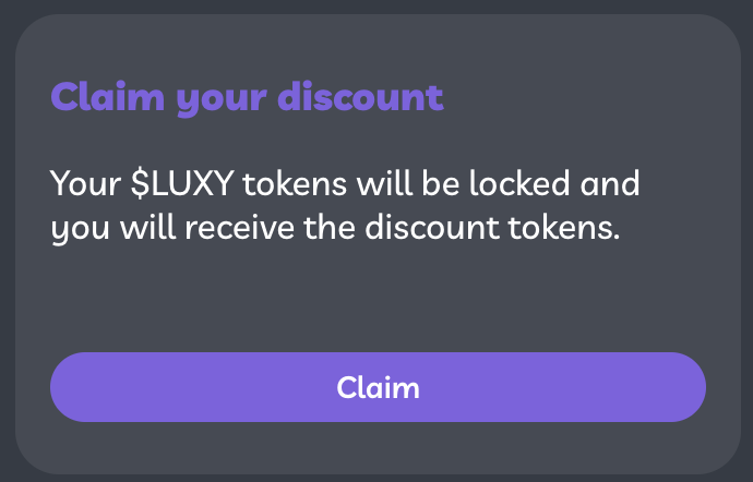 * 5\) On the modal that opens, you can select which discount tier you're interested in. You can find the amount of $LUXY that will be locked away below the Tier list. Next up, click on "Claim".