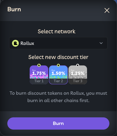 **If you have discount tokens in networks other than Rollux, you'll have to burn those first.**