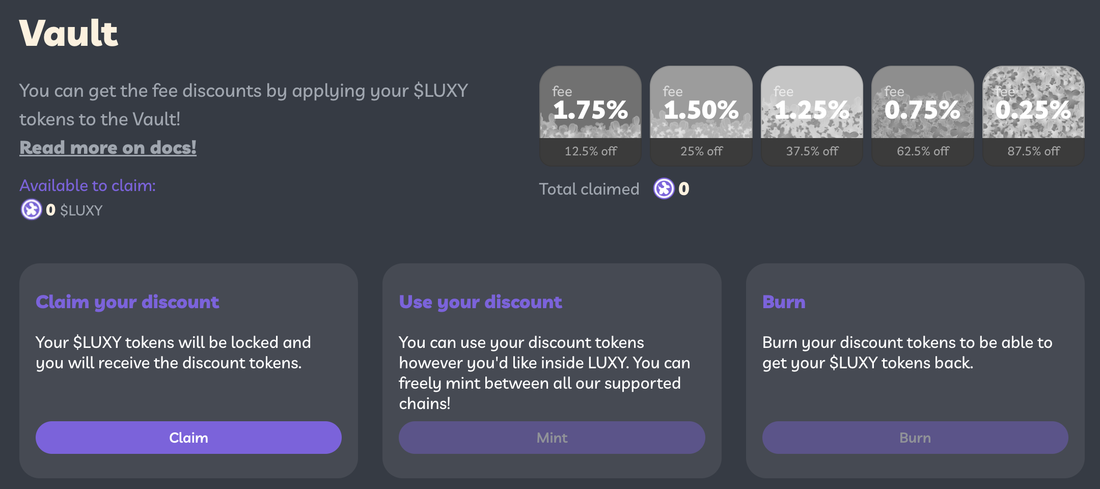 * 7\) Once the process is complete, you can enjoy the discounted fees on **all your Rollux transactions inside Luxy**! You can check your current fee in the Vault section!&#x20;