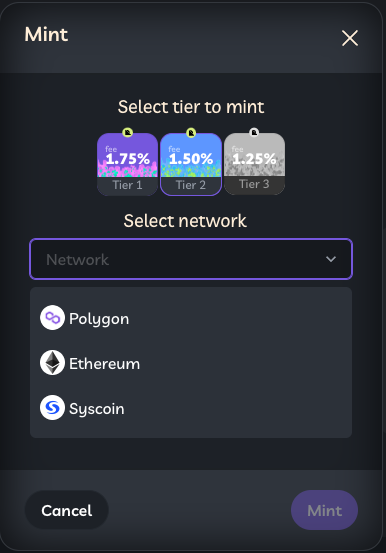 * 2\) In this step, you can choose the **discount tier you'd like to mint** and **one of the supported networks on Luxy**. Next up, click on "Mint".